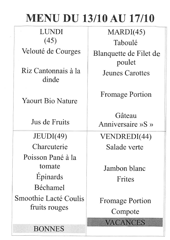 Menu de la cantine du Lundi 15 au vendredi 19 septembre 2025 :